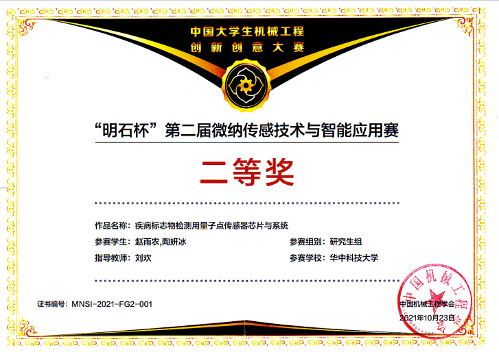 与此同时,课题组积极推进人才培养工作,2021以来相关研究结果获得湖北省第十三届“挑战杯”大学生课外学术科技作品竞赛一等奖、2021中国传感器创新创业大赛二等奖(华中赛区一等奖)、中国大学生机械工程创新创意大赛“明石杯”第二届微纳传感技术与智能应用赛二等奖等多项科技赛事奖项,受到国内学术同行关注和好评。