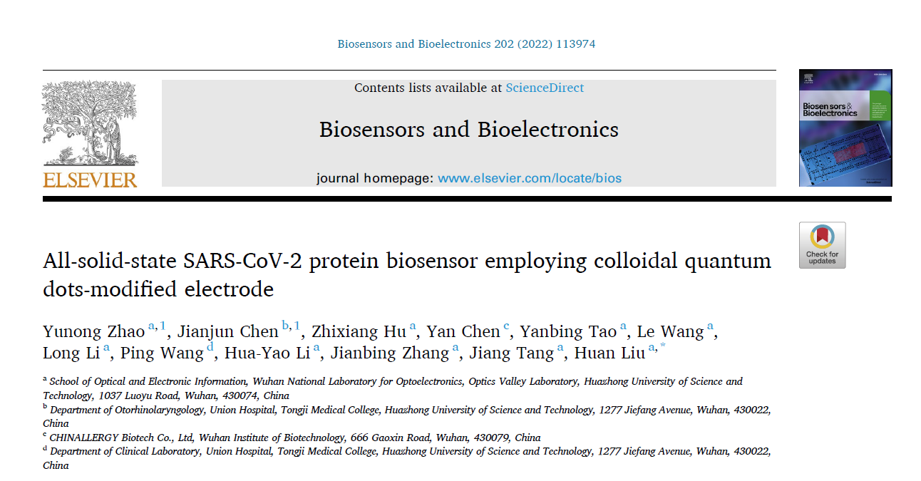 近日,我院刘欢教授课题组关于量子点半导体传感器的最新研究结果发表在生物传感器领域重要期刊Biosensors & Bioelectronics(2021年影响因子10.618),题为“All-solid-state SARS-CoV-2 protein biosensor employing colloidal quantum dots-modified electrode”,我校为论文第一和通讯单位,刘欢教授为论文通讯作者(详见https://doi.org/10.1016/j.bios.2022.113974)。