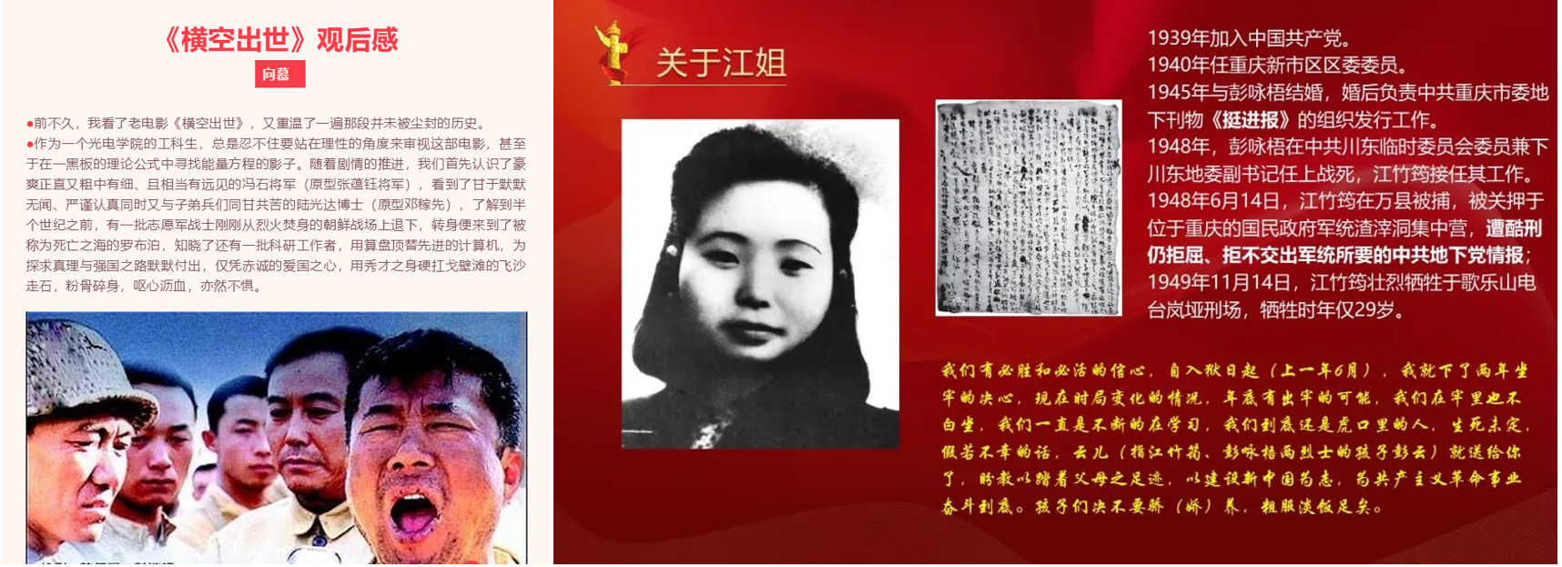 通过挖掘家乡党史故事,观看经典红色影视作品,许多同志对过去不太了解的革命人物、历史故事有了更深入的认识,对自己作为青年一代肩上所担负的重任有了更深刻的体会。在看完电影《横空出世》后,支部2019级党小组党员向慕回顾了老一辈共产党人在研发原子弹过程中所经历的艰辛,认识到了原子弹研制成功这一伟大成就对新中国的历史意义,他表示要将内心的震动化为自己前进的动力,为社会主义事业贡献自己的力量。支部2018级党小组党员胡耀丹重新学习了“红岩精神”和“江姐”江竹筠的革命事迹,深刻地认识到中国共产党人凝聚一心、永不屈服的革命精神,以及在应对挑战、化解难题时所呈现出的信仰力量。她表示,作为共产党员,自己更应该坚定信仰,并将信仰转化为力量,为祖国科技事业发展贡献出绵薄之力。
