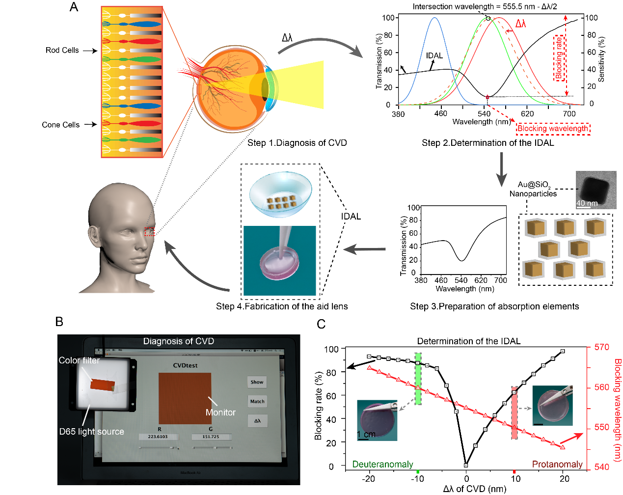本项工作提出了一种基于色盲患者的视锥细胞偏移,反向设计出具备精确矫正能力的色盲色弱矫正镜的设计方法。这种眼镜不但能提高患者对不同颜色的辨别能力,而且在日常生活中也能给患者还原一个近似正常人的丰富的色觉体验。同时,这种眼镜具备良好的生物相容性,高稳定性,良好的润湿性(佩戴舒适度)和低成本的优点,在未来的实际应用中具备很大的潜力。论文第一作者为伟德国际唯一官网入口,BETVLCTOR伟德在线,BV伟德官方网站博士生田野、博士后唐瀚川、硕士生康天誉,论文通讯作者为伟德国际唯一官网入口,BETVLCTOR伟德在线,BV伟德官方网站、武汉光电国家研究中心臧剑锋教授。该研究得到国家重点研发计划、国家自然科学基金资助支持。