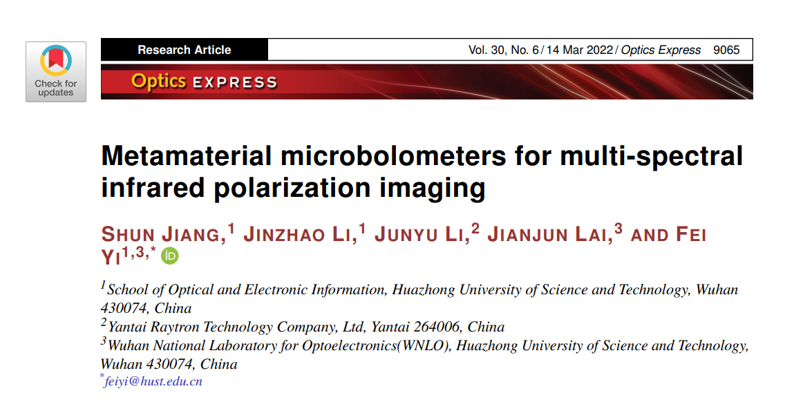 近日,我院易飞副教授课题组关于超表面集成式微测辐射热计研究成果发表在光学领域重要期刊Optics Express(影响因子3.894),题为“Metamaterial microbolometers for multi-spectral infrared polarization imaging”,我校为论文第一和通讯单位,博士生蒋顺为论文第一作者,易飞副教授为论文通讯作者(详见https://doi.org/10.1364/OE.452981)