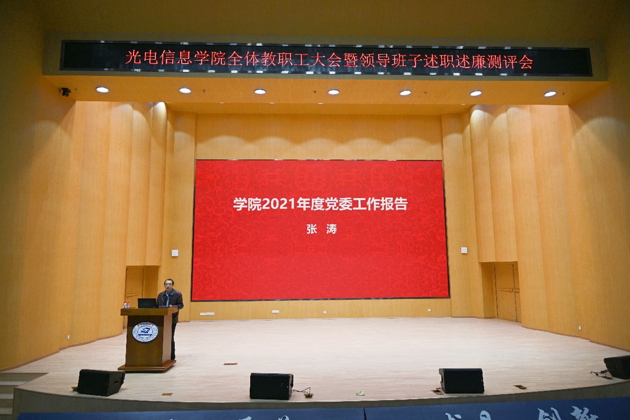 3月10日下午,我院在光电信息大楼C118会议室召开全院大会暨班子述职述廉测评会。大会包括学院2021年度党委工作报告、学院2021年度行政工作报告及2022年工作要点、全院教职工对党组织书记抓全面从严治党和基层党建工作情况、学院班子、中层领导进行民主测评、2021年度警示教育案例通报等四个主题。全院教职工参加了会议,会议由学院副院长吕文中主持。