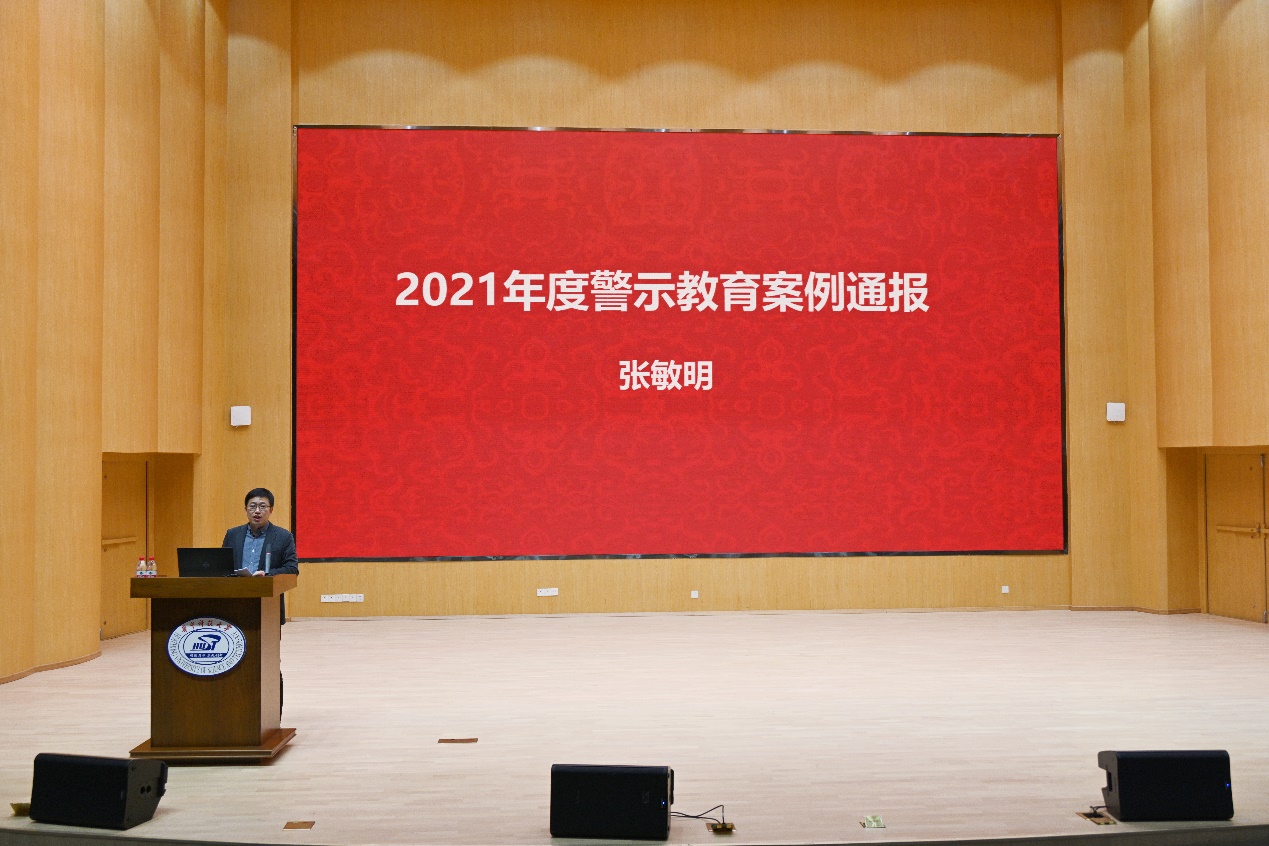 最后,纪委书记张敏明在会上作2021年度警示教育案例通报,教育全体教职工要遵守规章制度,并结合业务工作查找工作中存在的廉洁风险点,帮助广大教职工加强勤廉修养,积极采取措施,防范风险,要求教师在学术、科研、教学等方面严守廉政纪律,时刻要把党风廉政建设放在首位,努力营造光电学院风清气正、遵规守纪、勤奋做事的良好政治生态。