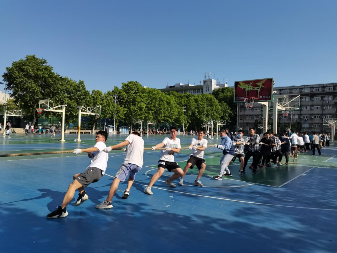 5月5日下午,东校区篮球场上烈日高照,但仍掩盖不住同学们的高涨的热情。随着裁判的一声哨响,拔河比赛如火如荼地开始了。教师班主任、研究生班主任,全体同学都以极高的热情参与其中。有的班级戴着头带,鼓舞士气;有的班级戴着面具,为比赛增添了几分趣味。队员们一起高呼着“一二、一二”,拼命地将绳子往后拉。四个比赛场地上号子声、助威声、欢呼声此起彼伏,响彻整个篮球场。