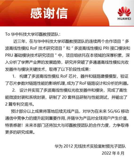 在此基础上,近三年邓磊教授团队与华为2012 WT-Lab进行了深入合作,先后开展了“多波高线性模拟RoF技术研究项目”和“多波高线性模拟PRI接口模块和PRU基础模块技术研究项目”两个合作项目(总经费超500万)。在合作过程中攻克了多通道高线性模块的多项关键技术:构建了多波高线性模拟RoF芯片、器件和链路的仿真模型,设计并实现了多波高线性模拟光收发器件和模块,研制成功20套样片并完成了性能测试。研究成果受到了华为技术团队的高度认可,并给学院发来了感谢信。