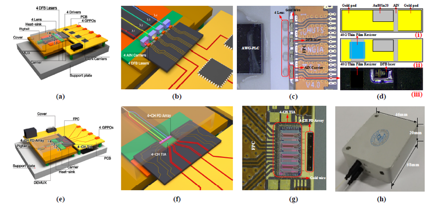 我院邓磊教授团队多年来一直致力于宽带模拟通信用光收发阵列芯片与模块国产化研究,在前期所承担的科技部863主题项目“宽带模拟通信用光收发阵列芯片与模块”(2015AA016900)中攻克了高线性激光器阵列芯片、大动态范围探测器阵列芯片和模块耦合封装技术,研制出具有自主知识产权的传输带宽大于10GHz的四通道模拟通信光收发模块,构建了RoF验证系统。