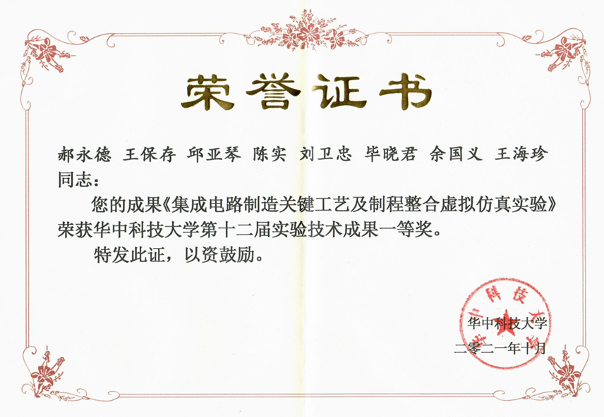 平台建设以来,获得了一系列的成果,2021年获12届《华中科技大学实验技术项目成果一等奖》,出版电子教材一部,软件著作权一项,依托该平台开展的实验课程《基于生产环境的集成电路光刻工艺互动式虚拟仿真实验》获湖北省一流课程,被推荐参选国家一流课程。2022年8月,入选中国高等教育学会第57届中国高等教育博览会对2021年度中国高等教育博览会“校企合作 双百计划”典型案例。