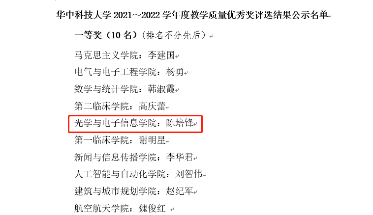 根据《华中科技大学教学质量优秀奖评选办法》(校本〔2021〕2号),经个人申报、院(系)初评与推荐、督导跟踪评议、个人教学工作汇报以及学校评审委员会评审,66名教师被确定为我校“2021~2022学年度教学质量优秀奖”推荐人选。其中,一等奖10名、二等奖56名。本年度教学质量优秀奖评选中,我院陈培锋老师喜获一等奖。