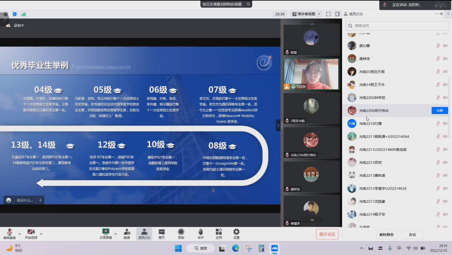 经过精心准备与筹划,12月15日星期四北京时间20:00,跨越时差和大洋的阻碍,2022级中法培养专项宣讲暨优秀中法校友分享会如期在线上举行,60余人参加了本次线上分享交流会。