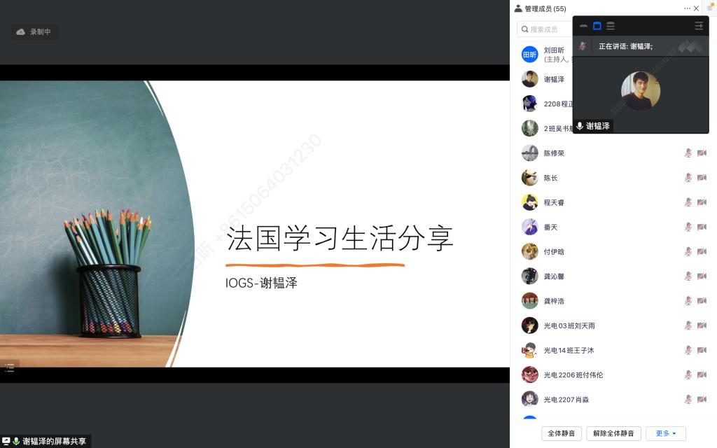 第二位嘉宾是谢韫泽,光电中法班2023届毕业生。谢同学于22年9月开始在法国高等光学所(Institut d’Optique Graduate School)攻读工程师学位。他是国家二级运动员。爱好看书和听音乐。