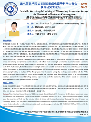 第9期联合研究生论坛于2022年10月29日在线上举办。IEEE学生会员、光电学院2017级博士生汪志城同学作为主讲,在本场研讨会上作了题为“Scalable Wavelength Locking of Micro-ring Resonator Arrays via Electronics-Photonics Convergence”(基于光电融合微环谐振器阵列的可扩展波长锁定)的技术分享学术报告。这一工作提出了一种微环谐振器的流水线时分复用(PTDM)控制方案和自适应步长技术,混合集成实现的波长锁定系统具有突破记录的波长跟踪速度和良好的控制器可扩展性。目前相关学术成果在JLT、OE等光学工程国际核心期刊上发表。