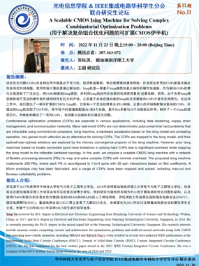 第11期联合研究生论坛于2022年11月23日在线上举办。IEEE会员、新加坡南洋理工大学2018级博士生苏钰淇同学作为主讲,在本场研讨会上作了题为“A Scalable CMOS Ising Machine for Solving Complex Combinatorial Optimization Problems”(用于解决复杂组合优化问题的可扩展CMOS伊辛机)的技术分享学术报告。这一工作提出了一种可扩展的CMOS Ising机,它具有一个灵活处理单元(PEs)网络,以最小的开销映射解决复杂的COPs(组合优化问题)。此工作制作了一个65nm的原型芯片,并映射和解决了一系列COPs,包括最大切割和布尔满足性问题。相关学术成果在JSSC、ISSCC、CICC等IEEE集成电路顶级期刊或会议上发表。