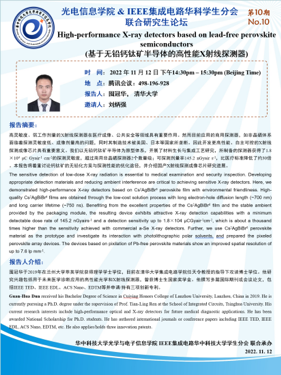第10期联合研究生论坛于2022年11月12日在线上举办。IEEE学生会员、清华大学2019级博士生囤冠华同学作为主讲,在本场研讨会上作了题为“High-performance X-ray detectors based on lead-free perovskite semiconductors”(基于无铅钙钛矿半导体的高性能X射线探测器)的技术分享学术报告。这一工作提出了一种高探测灵敏度、低成像剂量的X射线探测器,指出了开发更高性能、自主可控的X射线探测成像芯片具有重要意义。目前相关学术成果在ACS Nano、IEEE TED和EDTM等电子材料与器件期刊或会议上发表。