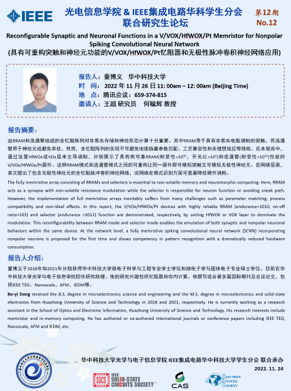 第12期联合研究生论坛于2022年11月26日在线上举办。IEEE学生会员、光电学院2021届硕士生董博义同学作为主讲,在本场研讨会上作了题为“Reconfigurable Synaptic and Neuronal Functions in a V/VOX/HfWOX/Pt Memristor for Nonpolar Spiking Convolutional Neural Network”(具有可重构突触和神经元功能的V/VOX/HfWOX/Pt忆阻器和无极性脉冲卷积神经网络应用)的技术分享学术报告。这一工作通过设置HfWOx或VOx层来主导调制,分别展示了具有高可靠RRAM(耐受性>1010,开关比>103)和选通管(耐受性>1012)性能的V/VOx/HfWOx/Pt器件。在网络层面,首次提出了包含无极性神经元的全忆阻脉冲卷积神经网络,该网络在模式识别方面可显著降低硬件消耗。相关学术成果在TED、Nanoscale、AFM、IEDM等电子器件与材料核心期刊或顶级会议上发表。