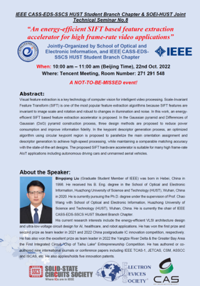 由于受近期疫情的影响,系列联合研究生论坛均为线上举行。第8期联合研究生论坛于2022年10月22日在线上举办。IEEE学生会员、光电学院2020级博士生刘炳强同学作为主讲,在本场研讨会上作了题为“An energy-efficient SIFT based feature extraction accelerator for high frame-rate video applications”(用于高帧率视频应用的基于SIFT的高能效特征提取加速器)的技术分享学术报告。这一工作提出了一种基于SIFT的特征提取硬件加速器芯片设计,适用于包括自动驾驶汽车和无人驾驶飞机等许多高帧率AIoT应用。该设计于2022年发表在IEEE电路与系统学会顶级期刊TCAS-I上。