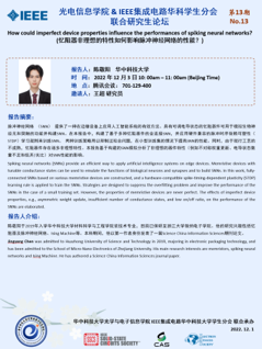 第13期联合研究生论坛于2022年12月3日在线上举办。材料学院2019级本科生陈敬阳同学作为主讲,在本场研讨会上作了题为“How could imperfect device properties influence the performances of spiking neural networks?”(忆阻器非理想的特性如何影响脉冲神经网络的性能?)的技术分享学术报告。在本报告中,构建了基于多种忆阻器件的全连接SNN,并应用硬件兼容的脉冲时序依赖可塑性(STDP)学习规则来训练SNN,并基于构建的SNN模拟分析了非理想的器件特性(例如不对称权重更新、电导状态数量不足和低开/关比)对SNN性能的影响。相关学术成果在Science China Information Sciences期刊上发表。