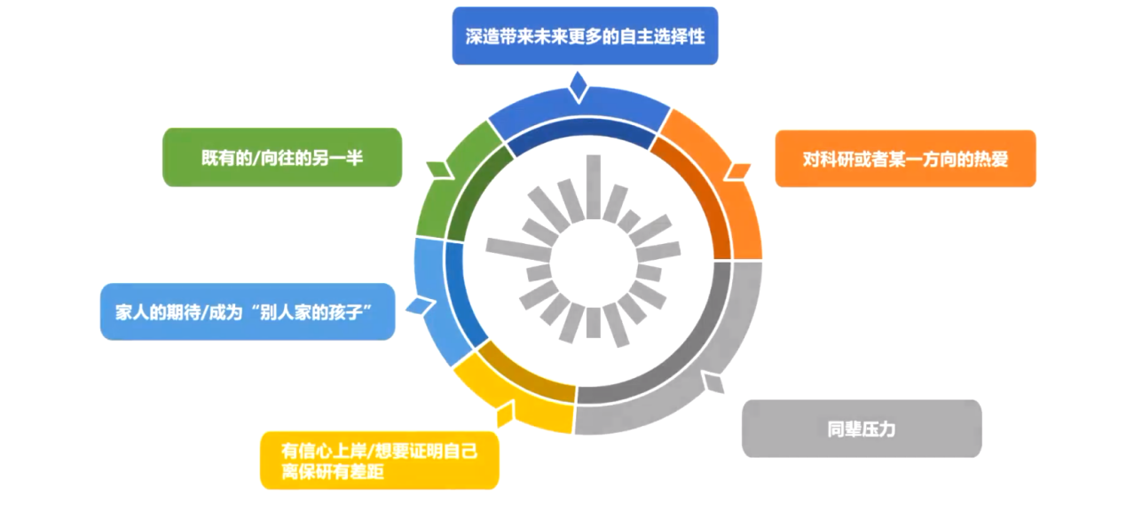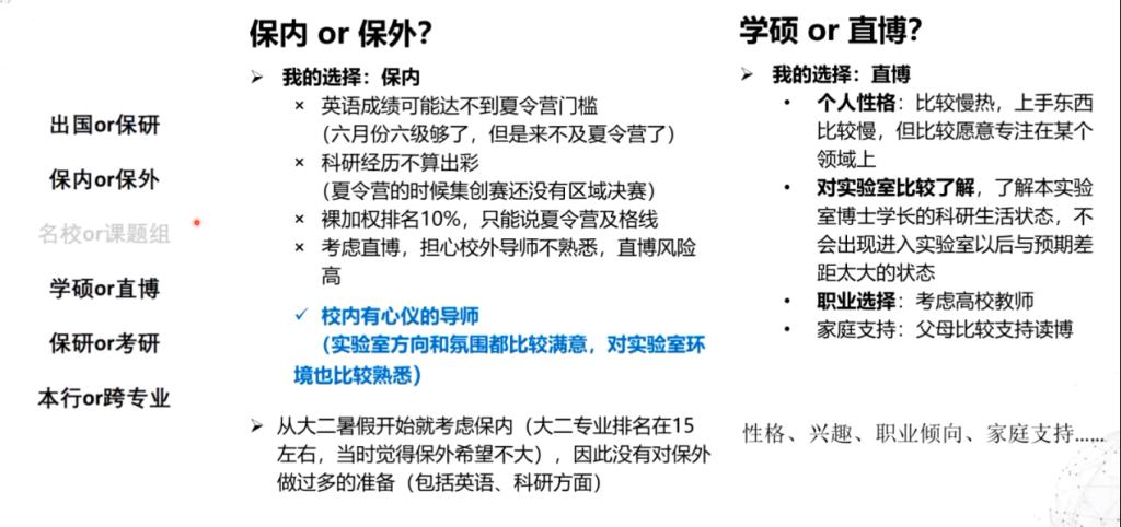 接下来,可怡学姐给分享了她个人对于保研选择的一些看法,对出国或保研、保内或保外、学硕或直博、保研或考研、本行或跨专业等几个维度的问题。