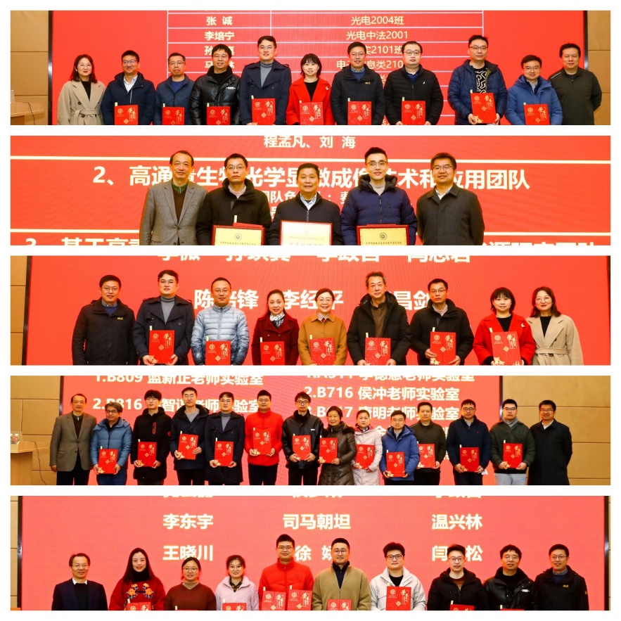 回顾2022年的成果,学院为在各方面做出突出贡献的老师颁发奖励证书,分别是优秀教师班主任、安全先进个人和团队、工会先进个人、优秀科研团队和光电学院2022年度十大新闻人物。共计46个老师和团队走上讲台,接受表彰。