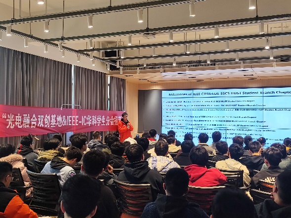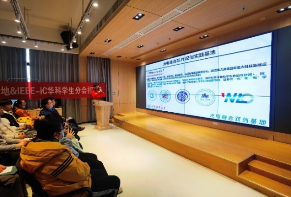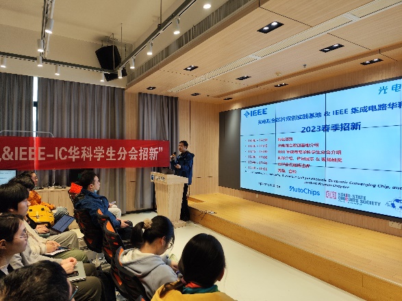 紧接着,IEEE华科集成电路学生分会主席许家瑞同学为同学们介绍了学生分会的基本情况以及与新创立光电融合双创基地之间的关系。他首先介绍了学生分会的理事会成员基本情况,展示了近两年来分会会员的发展情况。作为华科学子自创的对外学术交流国际平台,学生分会在过去一年里组织了累计15场学术报告、秋季招新推广活动、年度团建活动以及和其他分会的联谊交流活动等。值得肯定的是,IEEE华科学生分会自2021年正式成立以来,两年来共组织了数十场关于集成电路与包括光电、生医和机械等其他学科交叉融合的先进芯片技术讲座,其中包括已经开展了的光电融合芯片主题系列。这些代表着学科交叉融合先进理念的学术活动,不仅促进国际和国内的学术交流与合作,吸引了来自海内外各个高校的老师同学们参与其中,也培育了一批有学术能力、有实践经验、有创新热情、有创业追求的本科生和研究生同学致力于学术研究事业和实践创新活动。