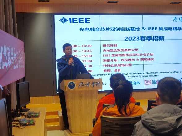 (通讯员:赵元声 胡澳)在2023年冬去春来之际,华中科技大学光电融合芯片双创实践基地(以下简称光电融合双创基地)在启明学院成功举办了2023年春季招新宣讲活动。本次活动由伟德国际唯一官网入口主办、启明学院协办,由IEEE电路与系统学会(CASS)、电子器件学会(EDS)和固态电路学会(SSCS)武汉联合会及华科学生分会(以下简称IEEE集成电路武汉联合分会和华科学生分会)和武汉杰开科技有限公司赞助,吸引了来自校内外师生的广泛关注和深度参与。一百多名来自光电信息学院、集成电路学院、未来技术学院、物理学院、机械学院、材料学院、电信学院、以及生命学院等多个院系的本科生和研究生同学参与了此次活动。