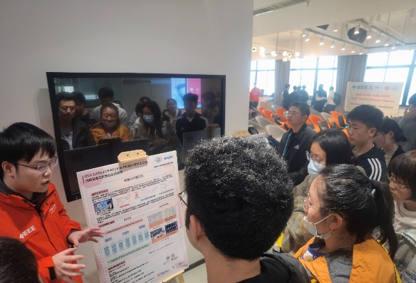 介绍结束后,光电融合双创基地和IEEE华科学生分会的现有成员通过海报宣讲和demo作品展示的形式向到场的同学们介绍前期取得的一些学术创新实践创新成果和未来计划的科研创新方向。光电融合双创基地目前的主要研究团队包括:武汉国家光电研究中心唐江老师带领的光电子器件与三维集成团队,主要研究方向为X射线探测器芯片、量子点红外成像芯片;光电信息学院王超老师带领的新型人工智能AI芯片团队,主要研究方向为光电传感AI融合芯片、存内AI计算芯片、类脑AI计算芯片、智能机器人/自动驾驶AI芯片;物理学院刘骅锋老师带领的智能微机电系统团队,主要研究方向为MEMS加速度计芯片、MEMS微震仪芯片,曾经指导学生参加包括互联网+大赛、研究生创芯大赛、研究生电子大赛、大学生光电大赛、大学生集创大赛等诸多顶级双创大赛获得国家金奖、国家一等奖十多项。此次海报宣讲和展示的活动取得了同学们的热烈反响,到场的同学热情交流,积极提问,收获满满。