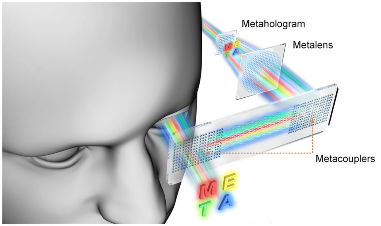 图1 基于多种超表面器件的波导AR显示系统概念示意图。系统中使用了三种类型的超表面器件,包括超透镜、超表面耦合器和超表面全息器件。