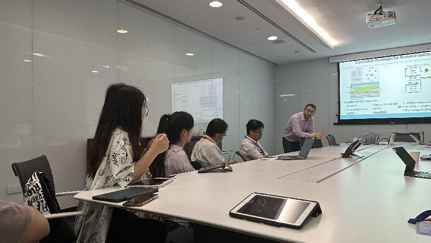 在参观体验的同时,四人在新加坡期间也与IME的科研团队进行了多次深入的学术交流讨论,得到了行业资深研究大牛的细心指导,收获颇丰。四位同学分别向IME集成电路系统设计部门的两位主管Kevin Chai老师与华科杰出校友GaoYuan老师,以及IME其他研究人员汇报了自己的研究工作及研究计划,得到了老师们的认可和指导建议。期间还有幸参加了来自代尔夫特理工大学Fabio教授的关于低温量子计算读出电路的讲座,并积极向其请教问题,受益匪浅。