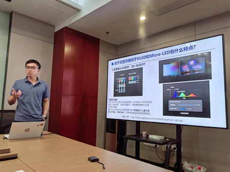 樊逢佳介绍了量子点LED显示技术的特点、所开发的电激发瞬态吸收光谱仪,并以此为基础,介绍了ZnO纳米颗粒作为电子传输层的魅力所在,以及如何通过量子点的偶极调控实现超高的外量子效率。报告以简单易懂的语言深入浅出地阐述了量子点显示方面的前沿研究,获得在座师生的一致好评。