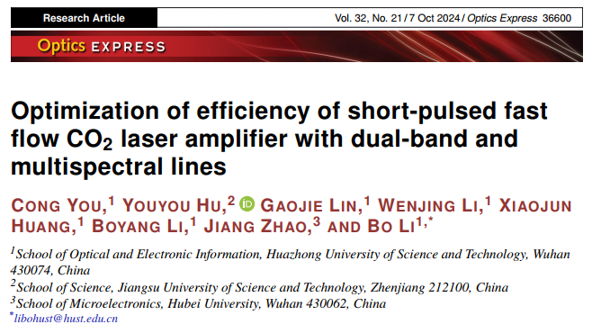 近日,光电信息学院李波课题组在面向极紫外光刻光源的短脉冲CO2激光高效放大领域取得重要进展。该团队的研究论文“Optimization of efficiency of short-pulsed fast flow CO2laser amplifier with dual-band and multispectral lines”在国际知名光学期刊《Optics Express》上发表。硕士生游聪为第一作者,伟德国际唯一官网入口,BETVLCTOR伟德在线,BV伟德官方网站为论文第一完成单位。