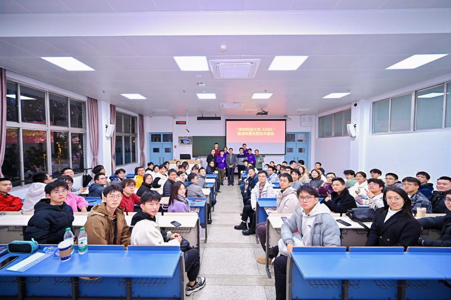 为发挥教育科技人才三位一体优势,加强产教融合人才培养,教学周13-14周期间,光电信息学院与未来技术学院联合ASML公司开设“集成电路光刻技术基础”课程。多位ASML技术专家通过系列讲座的形式,介绍ASML全景光刻技术概况。来自光电信息学院、未来技术学院、机械学院、材料学院等院系的60余名研究生和本科同学参加了此次课程。ASML公司Principle Scientist高伟民博士、ASML全球培训中心技术培训专家秦晓琼博士、ASML武汉地区客户服务经理熊泽军等ASML公司成员参与。光电信息学院李政言教授、院长助理张诚教授,学工组长张虎博士到场参加。