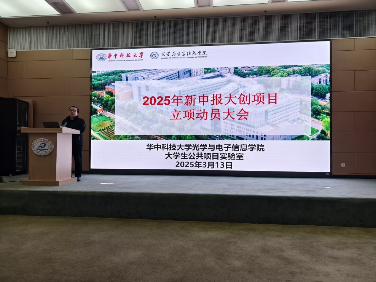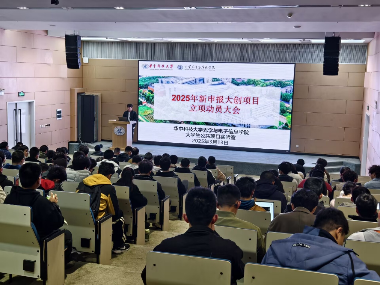 3月13日下午,我院2025年大创项目立项动员大会在光电信息大楼C117报告厅召开。我院院长助理张诚教授、大创优秀指导老师代表秦应雄教授、往届大创优秀团队代表光电20级徐奇睿学长、大学生公共项目实验室(以下简称“实验室”)邓前松老师、大学生公共项目实验室管委会部分成员和学院2025年度立项的共88个大创项目的团队成员共300余名师生参加了动员会,实验室学管会项目部副专委马浩轩同学主持了动员会。