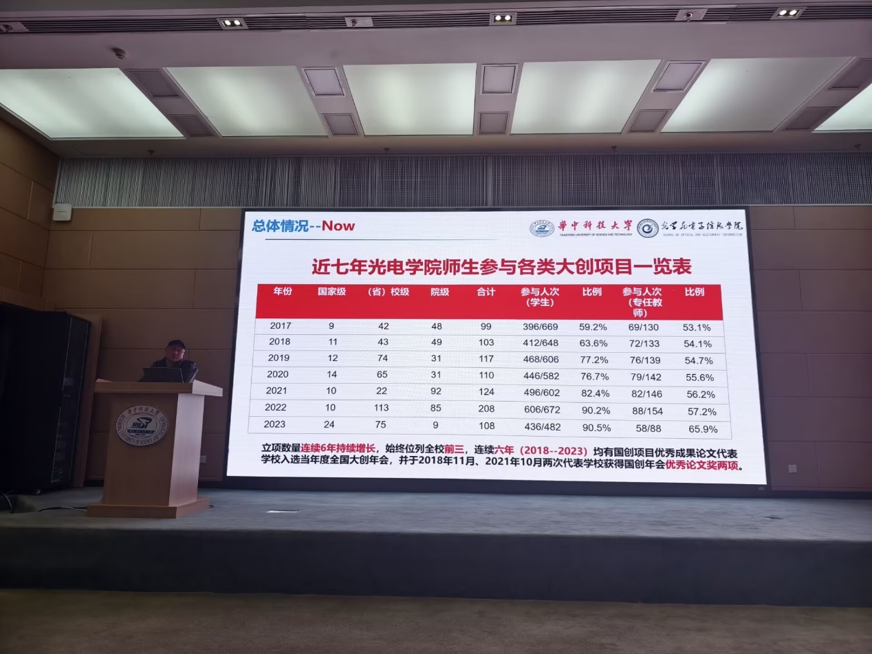 据悉,作为17个国家试点学院之一,多年来,光电信息学院依托学院大学生公共项目实验室,建立了以国家级项目为牵引的国家级、省级、校级、院系级四级大创项目管理模式,以院系级孵育,校级完善,国家级、省级项目深入开展的方式,努力贯彻执行学校提出的实施创新创业“双向百分百”计划,全面开展科研训练,推动本科生早进课题、早进实验室、早进团队。自“创新创业双向百分百”计划实施以来,学院逐步形成了从课内到课外、从创新到创业,校内校外相结合,以自主实践、创新驱动、团队协同、学科交叉为鲜明特色的大学生创新创业教育体系。