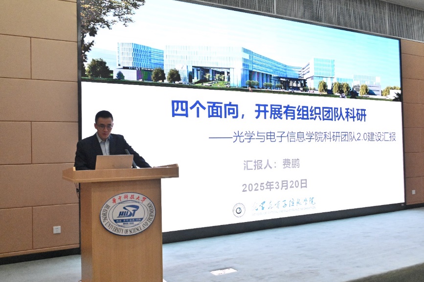 随后,副院长费鹏以“四个面向,开展有组织团队科研”为题,就学院科研团队2.0建设方案进行了详细汇报。费鹏副院长从高水平科技自立自强的时代要求出发,结合学院发展的新阶段,阐述了团队2.0建设的紧迫性和必要性。他强调,科研团队建设将紧密围绕国家重大战略需求,强化有组织科研,提升团队创新能力和成果转化效率,同时,费鹏副院长还对保密工作部署进行了详细介绍,确保科研活动在安全的轨道上运行。