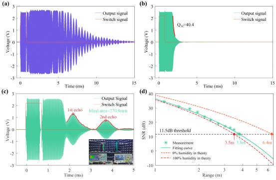 图3 性能测试结果。(a)密封处理前PMUT的余振信号;(b)密封处理后PMUT的余振信号;(c)密封处理后PMUT的盲区测试结果;(d)密封处理后PMUT的信噪比与探测距离关系