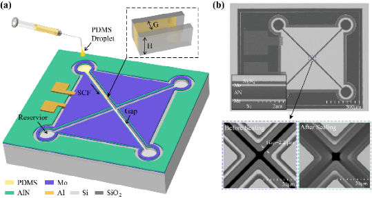 为解决上述问题,本文创新性地提出了一种结合储液池结构与自密封后处理软连接策略的悬臂梁基PMUT设计。该方案通过向储液池内注入PDMS液体,利用毛细效应,使低表面张力的PDMS流体自发地填充悬臂梁之间的狭缝;经过烘固化烤后,低杨氏模量PDMS在相邻悬臂间形成柔性连接层,在保持器件原始机械性能的同时提供足够的剪切刚度,从而有效地抑制了异步振动模态。