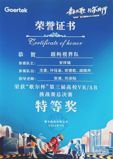 在7月16日至18日于青岛举办的“歌尔杯”第三届高校VR/AR挑战赛总决赛中,我院张诚教授课题组的参赛项目“超构准直透镜赋能下一代轻薄高性能AR显示”荣获特等奖。团队成员包括我院硕士研究生安祥瑞、沈漉、孙钰涵、郑德乾和博士研究生胡雨卉,指导老师为张诚教授和刘泽阳讲师。