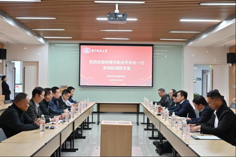 11月7日下午2时,赤壁市委副书记、市长彭光平率政企代表团到访华中科技大学光电学院,在光电信息大楼C111开展交流座谈,光电学院副院长聂明局主持会议,双方围绕光电子信息产业协同发展深入交换意见。
