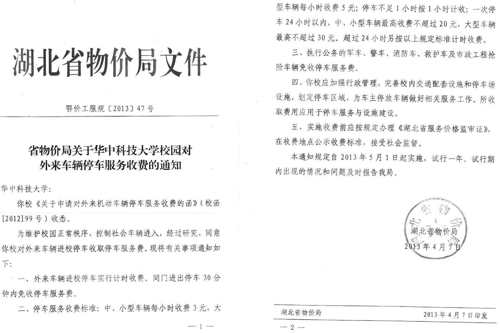 根据《省物价局关于华中科技大学校园对外来车辆停车服务收费的通知》(鄂价工服规〔2013〕47号),我校将于2013年5月1日起,实施对外来车辆进校停车收取停车服务费。办理了机动车门禁系统信息录入的机动车辆由系统自动识别放行;外来车辆进入校园时须领取“临时通行计时卡”,离开时将卡交回并交纳停车服务费。