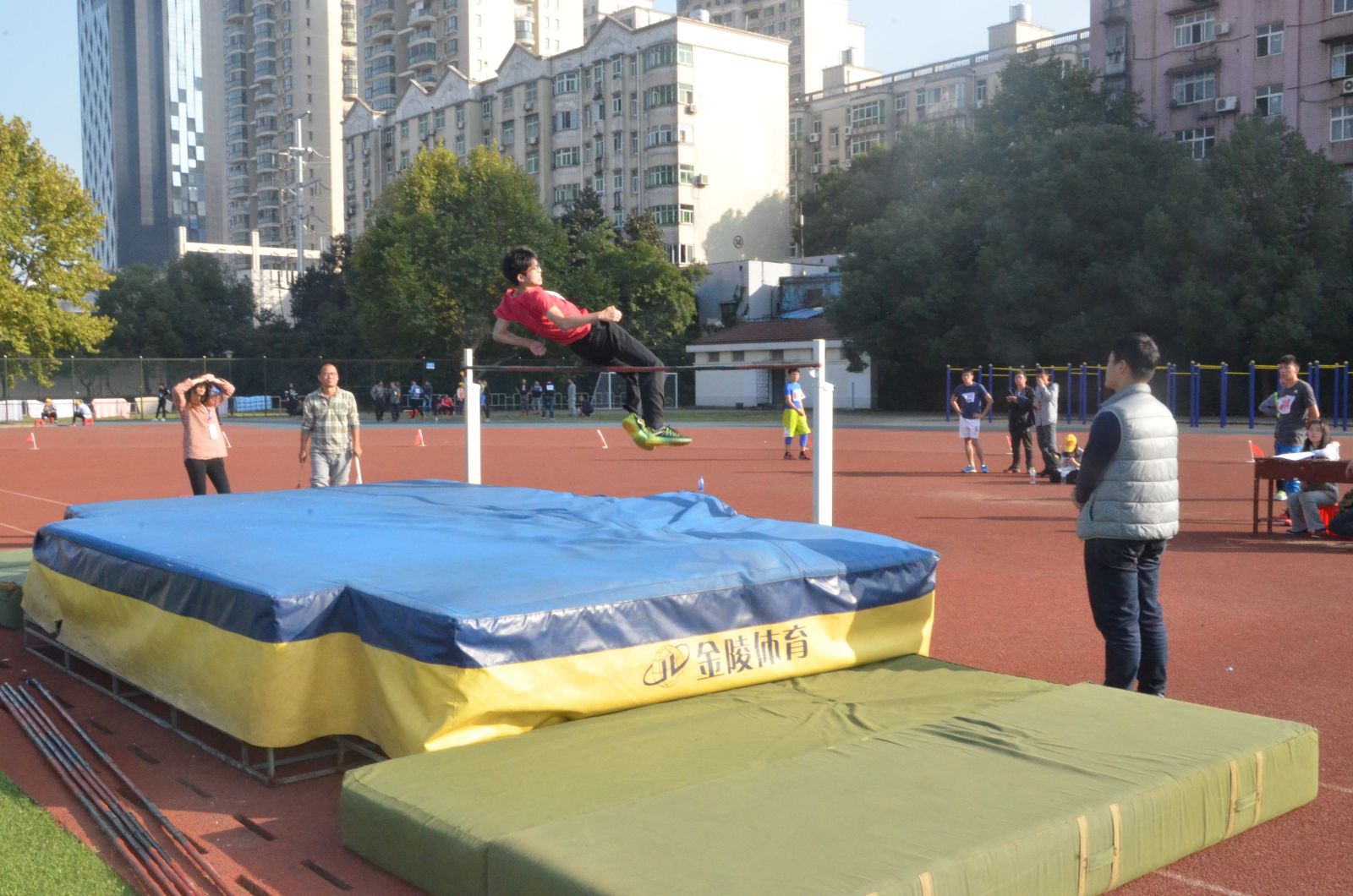 同时进行的还有甲组男子跳高预决赛,光电学院的3位男生表现突出。大四学生程睿超越自我以1.66m的高度斩获银牌。在上午的甲组男子跳远中,许钟全李镕骅分别位居第五名第七名。他们在一次次的 起跳,飞跃,反复尝试中绽放异彩,终在跳远比赛中为光电学院赢得13分!