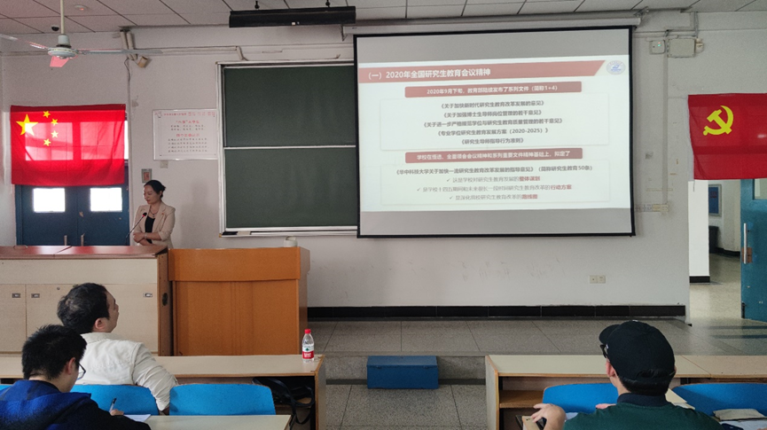 随后,研究生工作办公室副主任吴疆鄂老师作专题报告——坚持立德树人,培养堪当民族重任的时代新人。吴疆鄂老师从2020年首次全国研究生教育会议的重要指示精神出发,介绍了研究生思政工作背景,接着系统讲解了研究生思政工作的主阵地、主线和以奖助体系为基础的育人导向。她指出,研究生思政工作的主阵地是党支部,党支部的工作质量直接关系到研究生思想政治教育的质量。她强调,我们要注重思想政治引领、创新精神培养、社会实践教育三条主线,让有信仰的青年学生讲信仰,让华中科技大学研究生站在创新最前沿,让研究生把论文写在祖国大地上。
